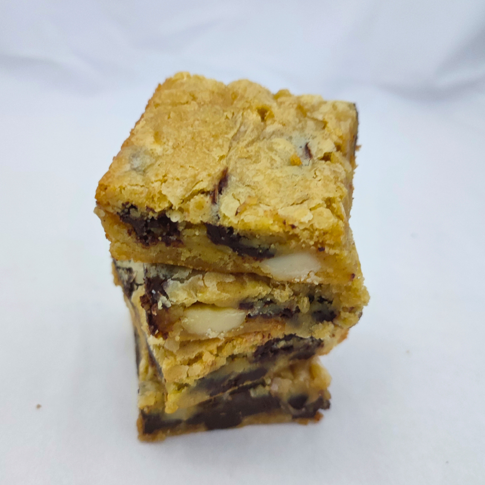 Fudgy white chocolate and browned butter blondie filled with roasted macadamia nuts and dark chocolate pieces.