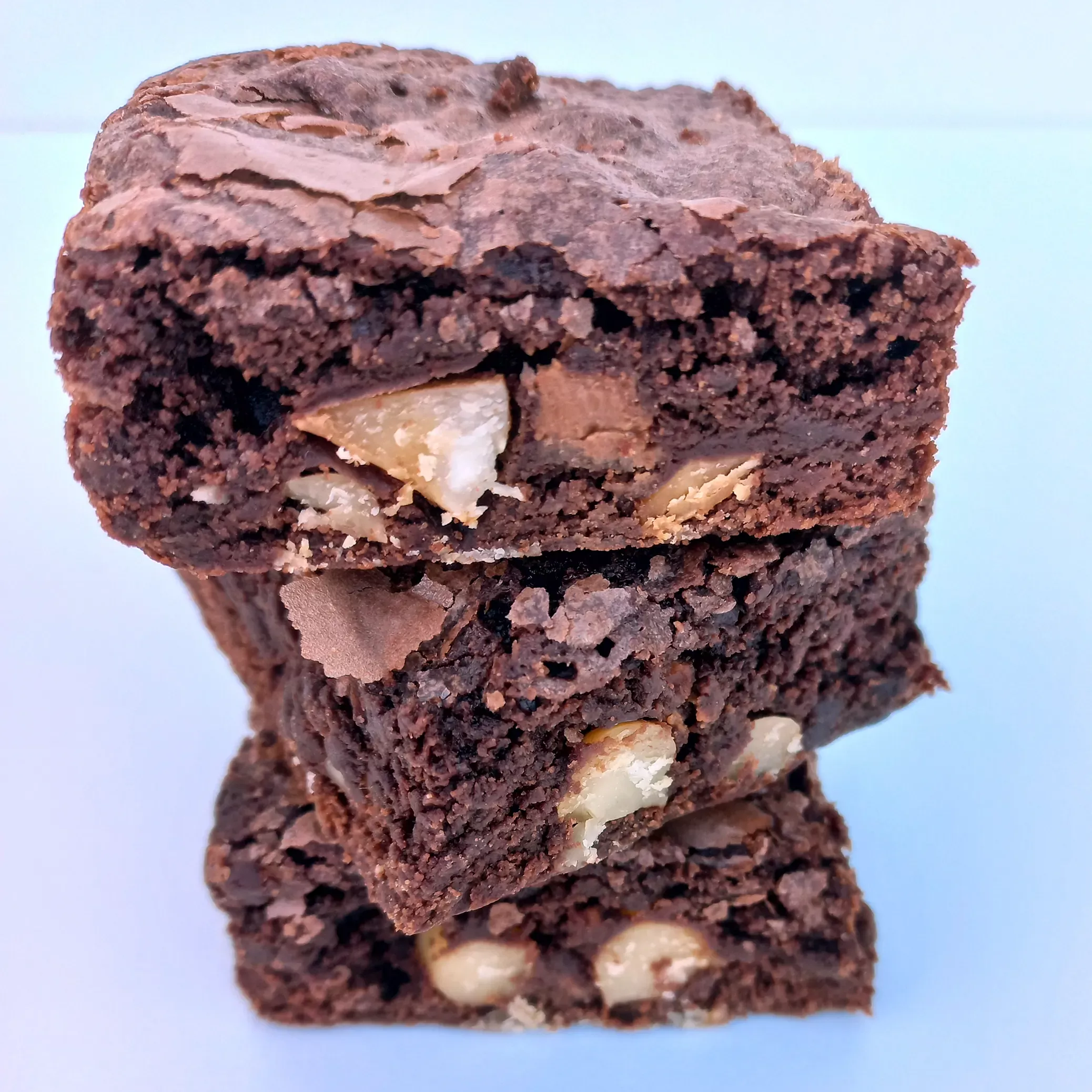 Yummy fudgy brownie squares with roasted macadamia nuts and chocolate chunks.